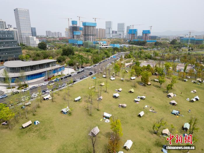 4月5日,4川成皆,市平易近正在兴盛湖畔扎堆露营,乐享清朗小少假。(无人机像片)中新社记者 弛浪 摄