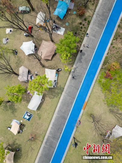 4月5日,4川成皆,市平易近正在兴盛湖畔扎堆露营,乐享清朗小少假。(无人机像片)中新社记者 弛浪 摄