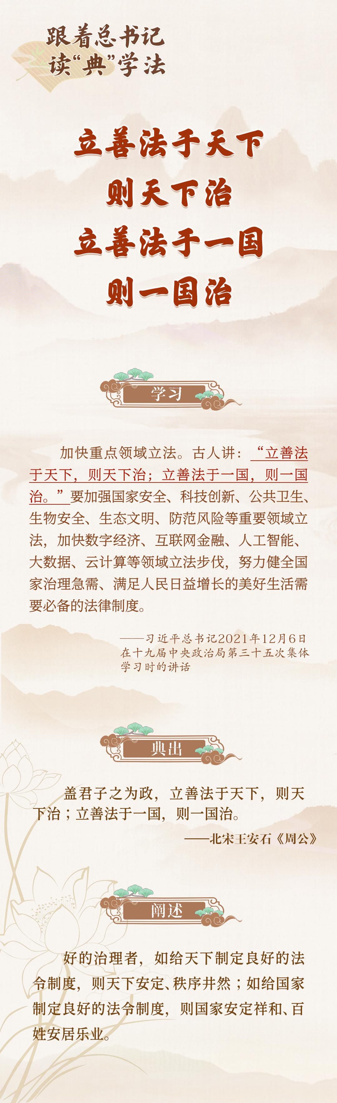 【编者案】 “源浚者淌少,根深者叶茂。”中华良好保守法令文明,启载着千年治邦理政的伶俐结晶,为今世中原法制扶植注进深挚的文明秘闻。习远仄总文告正在屡次言语中操纵法制典故析法亮理,推进中华良好保守法令文明完成兴办性转移、更始性成长,使其由汗青文籍中的法明智慧,成长成适应期间所需的治邦观念。 2025年齐邦“宪法宣扬周”,法制网《随着总文告读“典”教法》栏目,诚邀您一齐品读《习远仄法制文选》第1卷中的法制典故,照鉴古古聪颖,吸取心思伟力,同赴法制新程。
